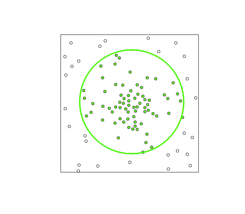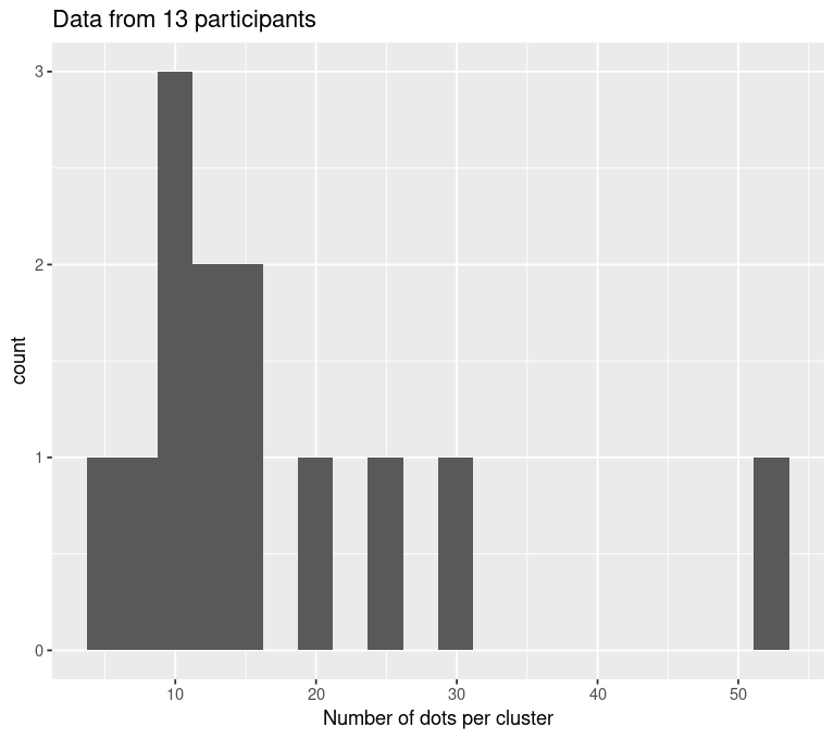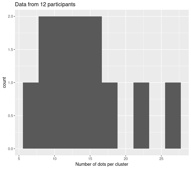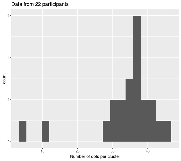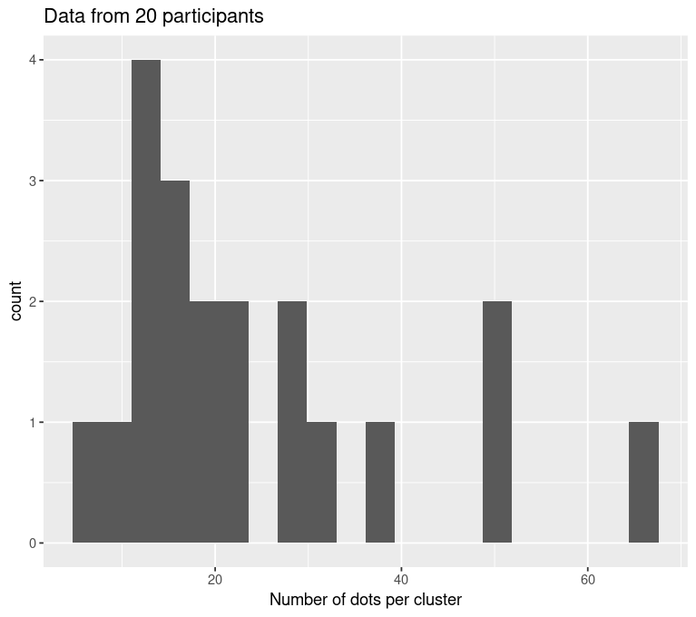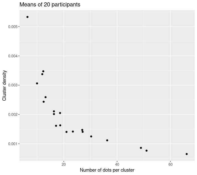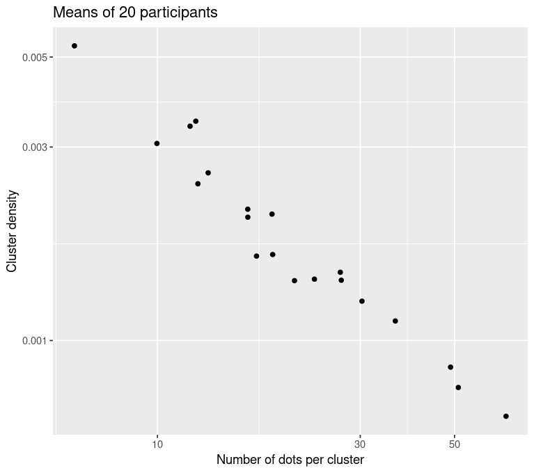 Green ribbon = standard error of the mean for simulated baseline data (from 180 trials) \(y = f(x) = cluster\ density(number\ of\ dots)\)