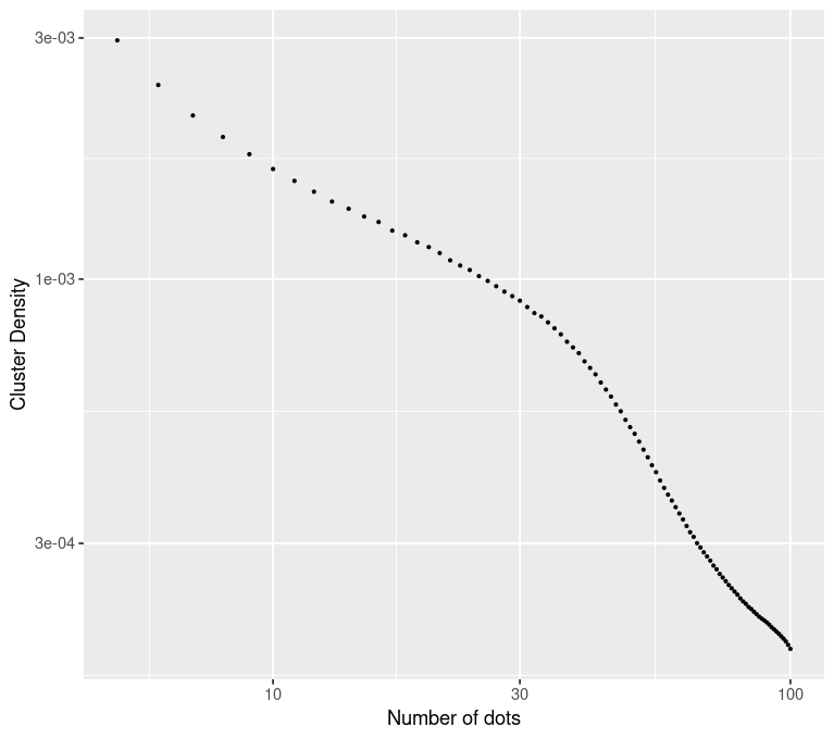 Recalculate cluster measurements for clusters of different numbers of dots: from 1 to 100 dots