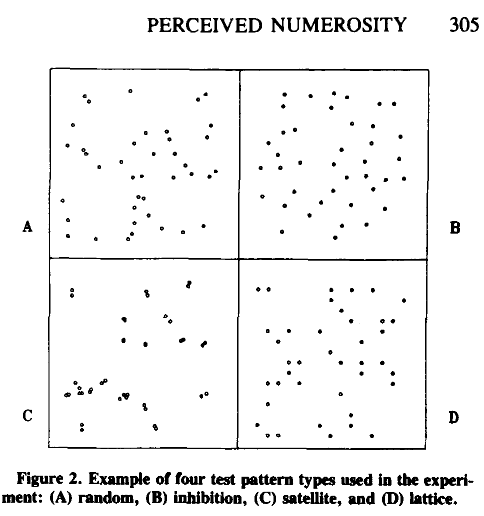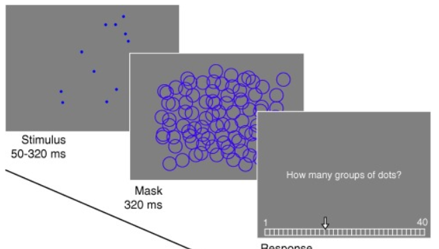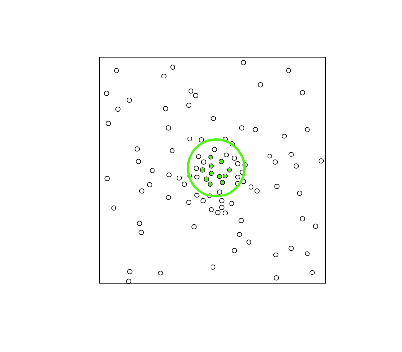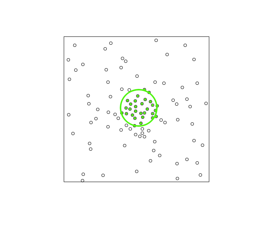 Green ribbon = standard error of the mean for simulated baseline data (from 180 trials) \(y = f(x) = cluster\ density(number\ of\ dots)\)