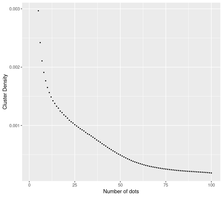 Recalculate cluster measurements for clusters of different numbers of dots: from 1 to 100 dots